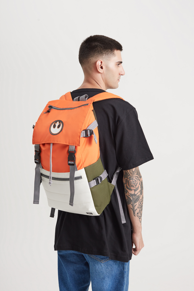 Mochila temática de Star Wars inspirada en la Alianza Rebelde, con un diseño que combina naranja, blanco y verde oliva, evocando los trajes de los pilotos rebeldes. La solapa superior destaca el emblema icónico de la Alianza, ideal para fans que buscan mostrar su lealtad a la Rebelión. Funcional y estilosa, perfecta para cualquier ocasión.