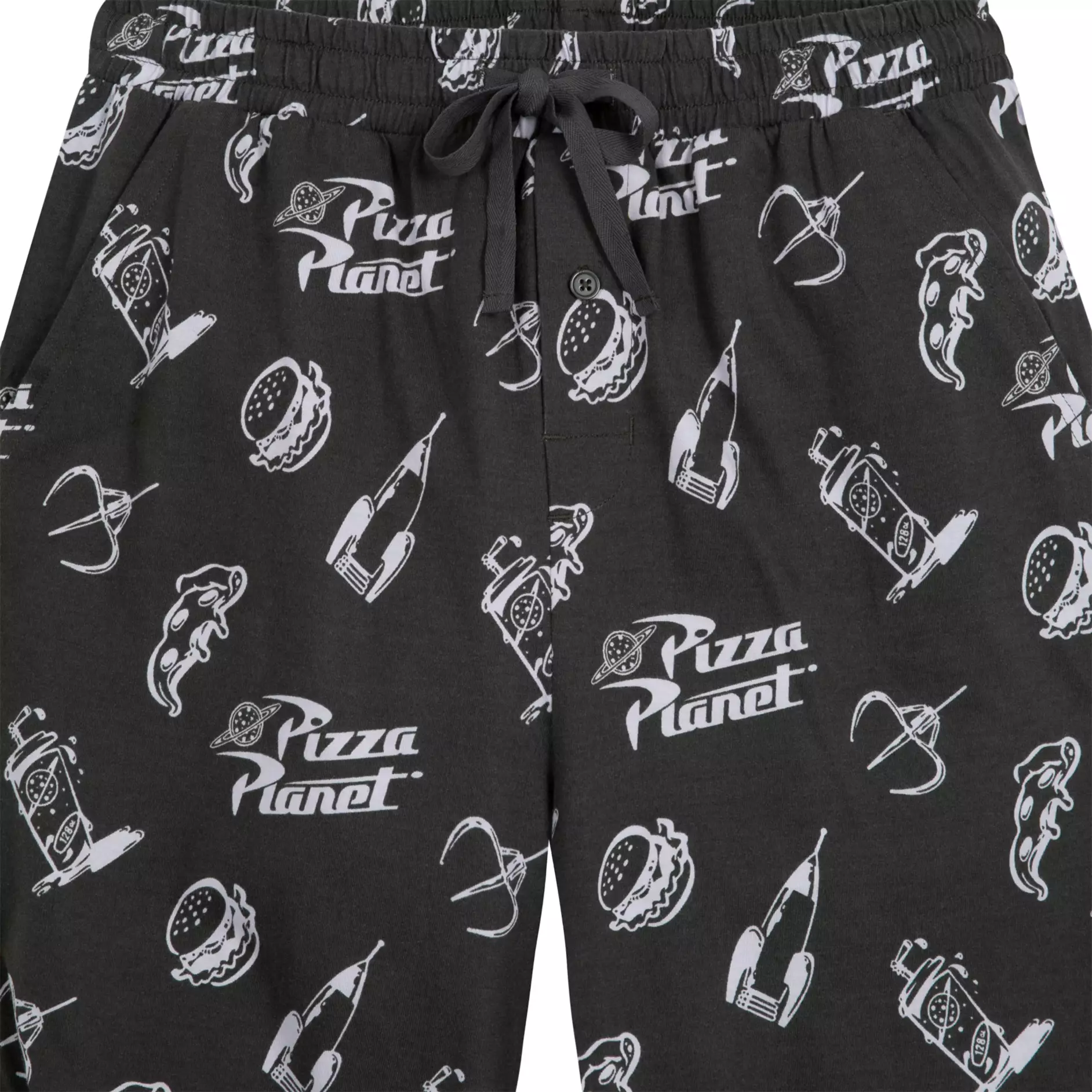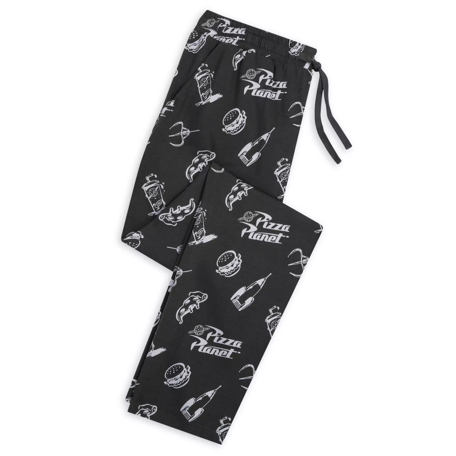 Pantalones de pijama inspirados en Pizza Planet de Toy Story. Sobre fondo negro, el diseño incluye logotipos, cohetes, alienígenas, hamburguesas y más en blanco, creando un contraste elegante y divertido. Perfectos para combinar con camisetas básicas o temáticas. ¡Ideales para noches de película o maratones de Disney!