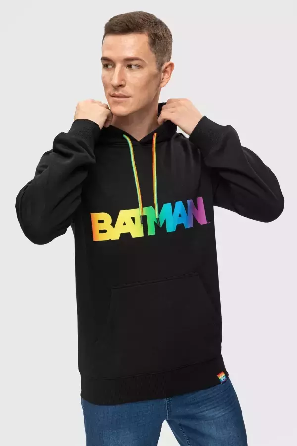 PolerĂ³n Batman DC Pride negro con un llamativo logo “BATMAN” en colores arcoĂris, que celebra la diversidad. Incluye un bolsillo frontal tipo canguro y cordones multicolores ajustables. Ideal para un look moderno, cĂ³modo y audaz que combina con cualquier outfit casual. ¡Un bĂ¡sico lleno de orgullo!