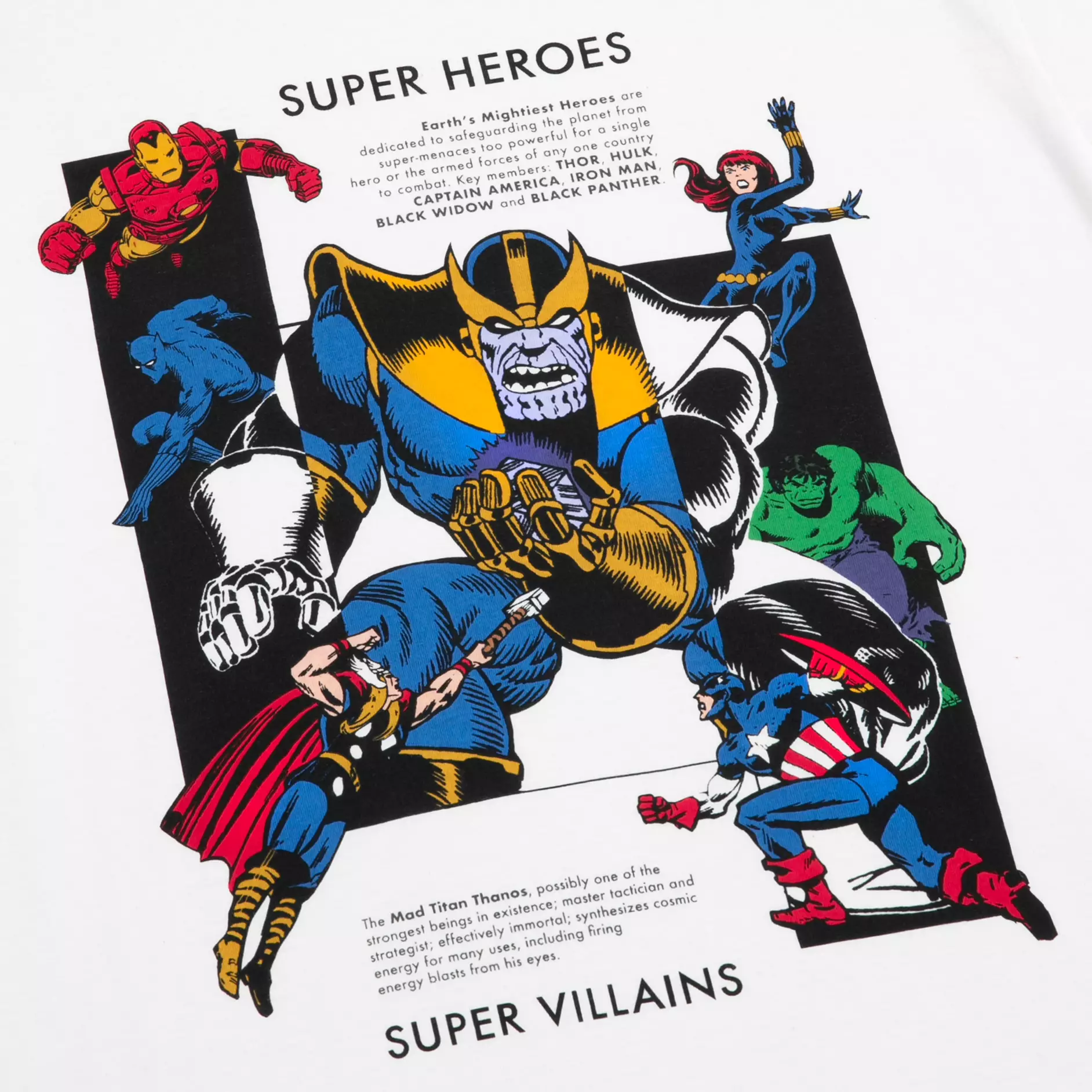 Camiseta blanca inspirada en los cómics clásicos de Marvel. Presenta a Thanos rodeado por héroes como Iron Man, Thor, Hulk, Black Widow, Black Panther y Capitán América en estilo retro fiel a los cómics originales. Ideal para combinar con jeans o pantalones casuales, es perfecta para eventos temáticos o para fans del universo Marvel.