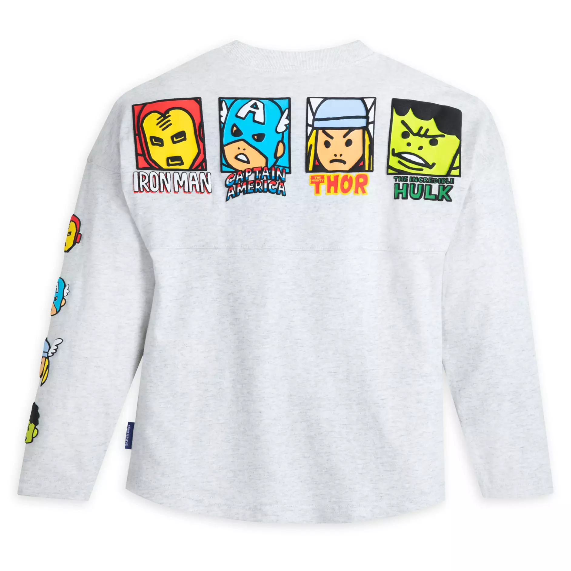 Camiseta de manga larga inspirada en Marvel, con el logotipo clásico en rojo y blanco sobre fondo gris claro. Las mangas incluyen gráficos de Iron Man, Capitán América, Thor y Hulk, mientras que la parte trasera destaca un diseño ampliado con sus nombres. Ideal para combinar con jeans o joggers, perfecta para salidas informales o maratones de películas de Marvel.