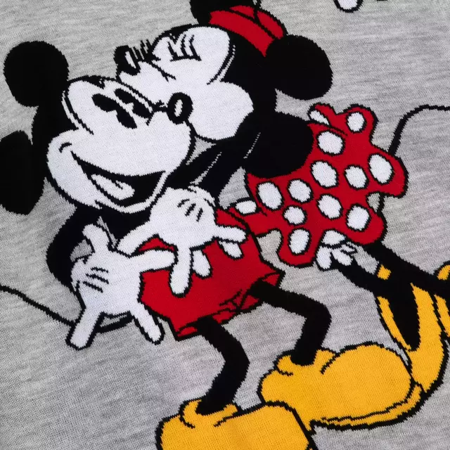 Suéter gris de manga larga con diseño romántico inspirado en Mickey y Minnie Mouse. Presenta una ilustración tejida de los personajes compartiendo un tierno momento, con detalles icónicos como los pantalones rojos de Mickey, el vestido de lunares de Minnie y una margarita. Versátil y atemporal, combina perfecto con jeans o tonos neutros.